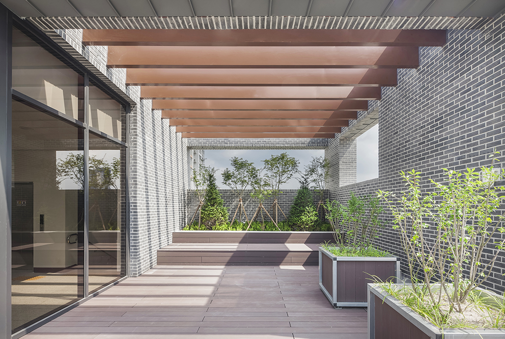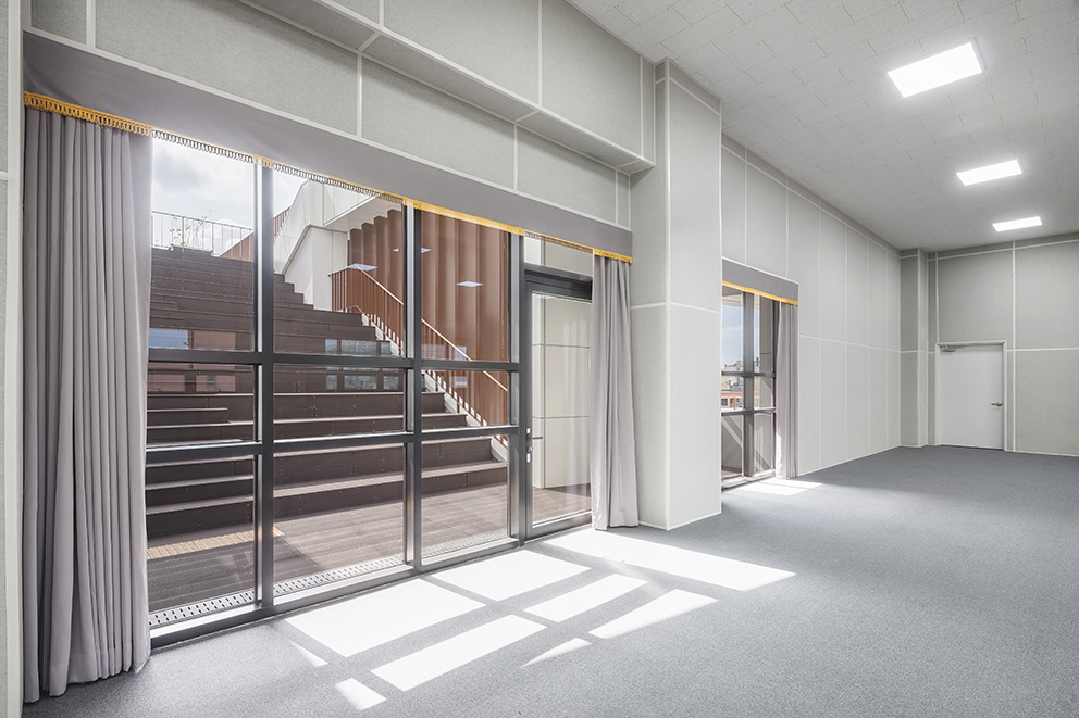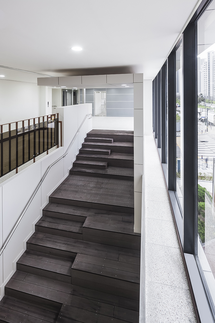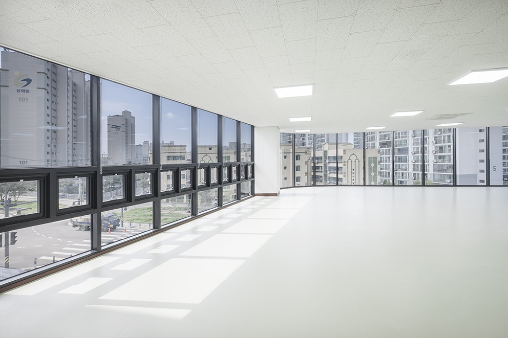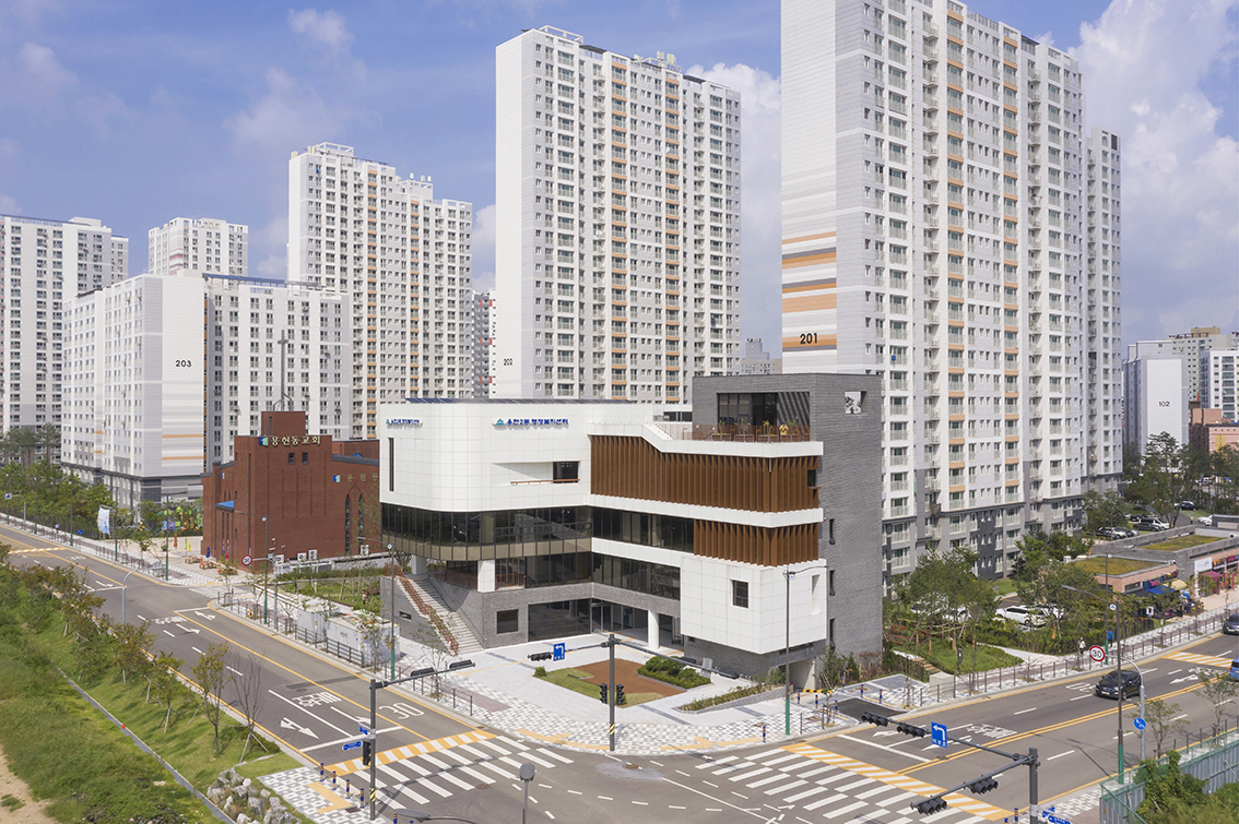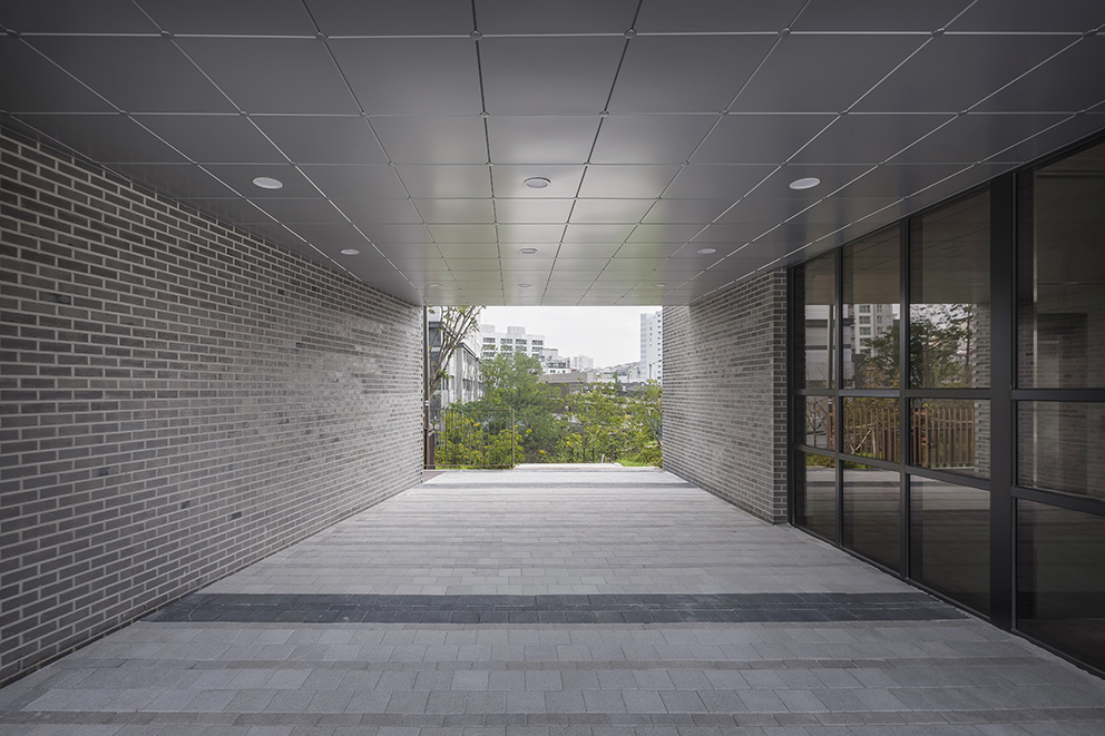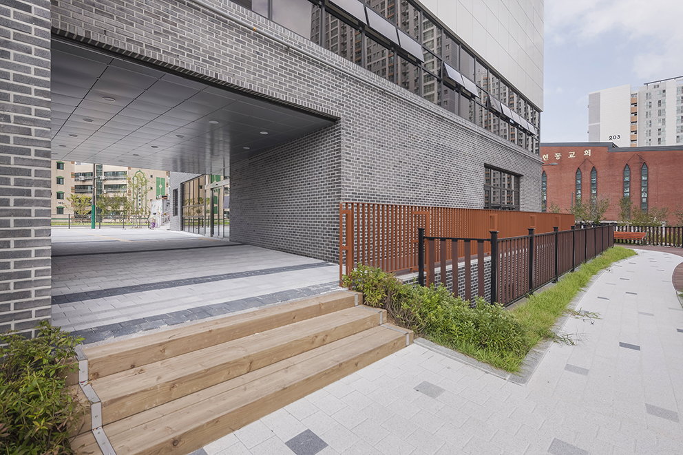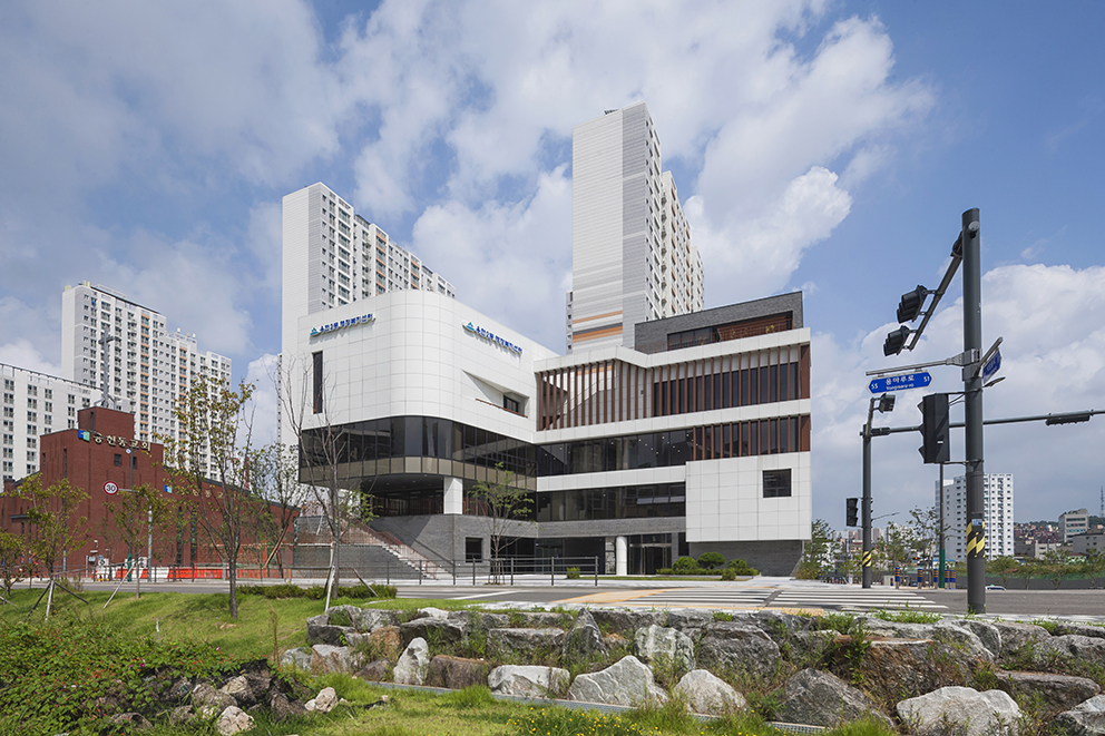 도로 건너편의 철도공원과 공공청사의 뒤쪽으로 조성된 근린공원을 유기적으로 이어주기 위해서 1층의 보행통로를 만들었다. 코너 대지에서의 접근성과 심미성을 고려한 ㄴ자형 배치를 하고 통경축을 열어 건축이 주변을 이어주는 매개공간으로 작동하도록 하였다.